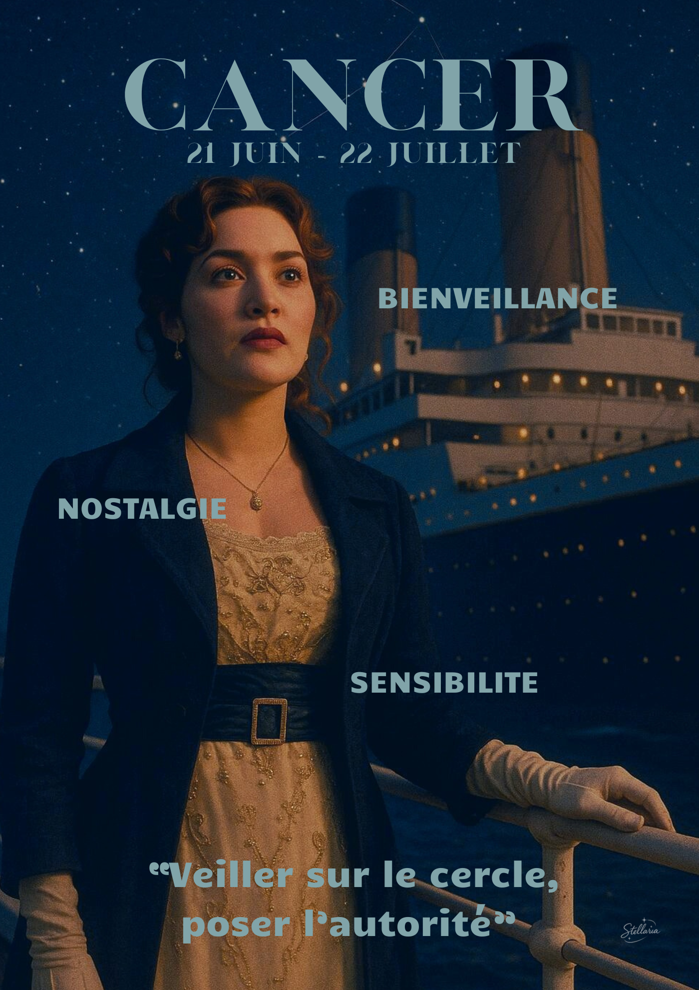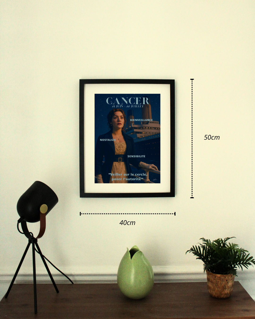 Célébrez votre signe astrologique avec cette magnifique affiche du Cancer associée à l'héroïne du célèbre film de "Titanic". Design élégant et intemporel, parfait pour décorer votre intérieur dans une ambiance de cinéma.